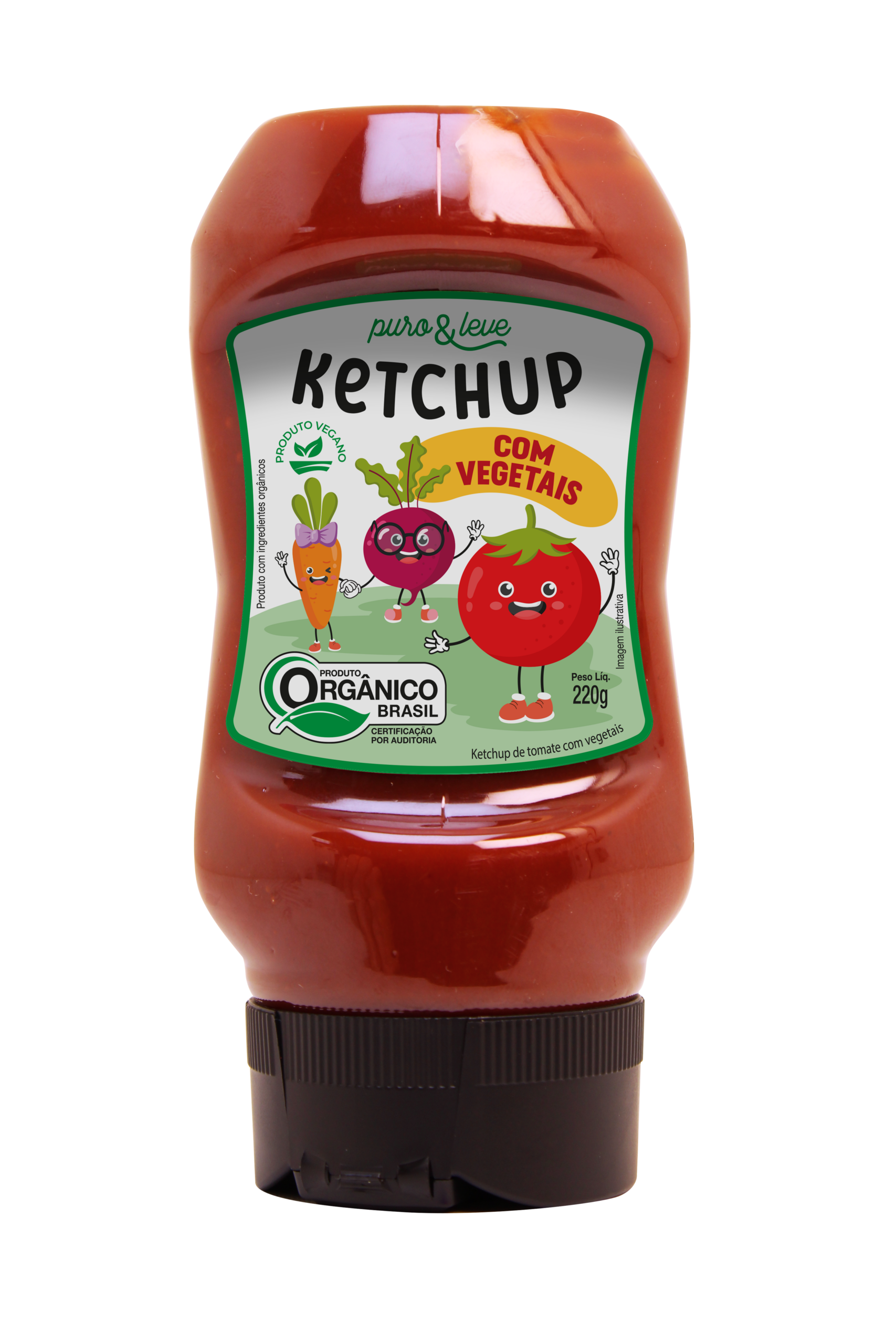 KECHUP KIDS ORGÂNICO 220G – Lista de ingredientes: Tomate*, polpa de frutas (pera e maçã), polpa de tomate concentrada, cenoura*, vinagre*,