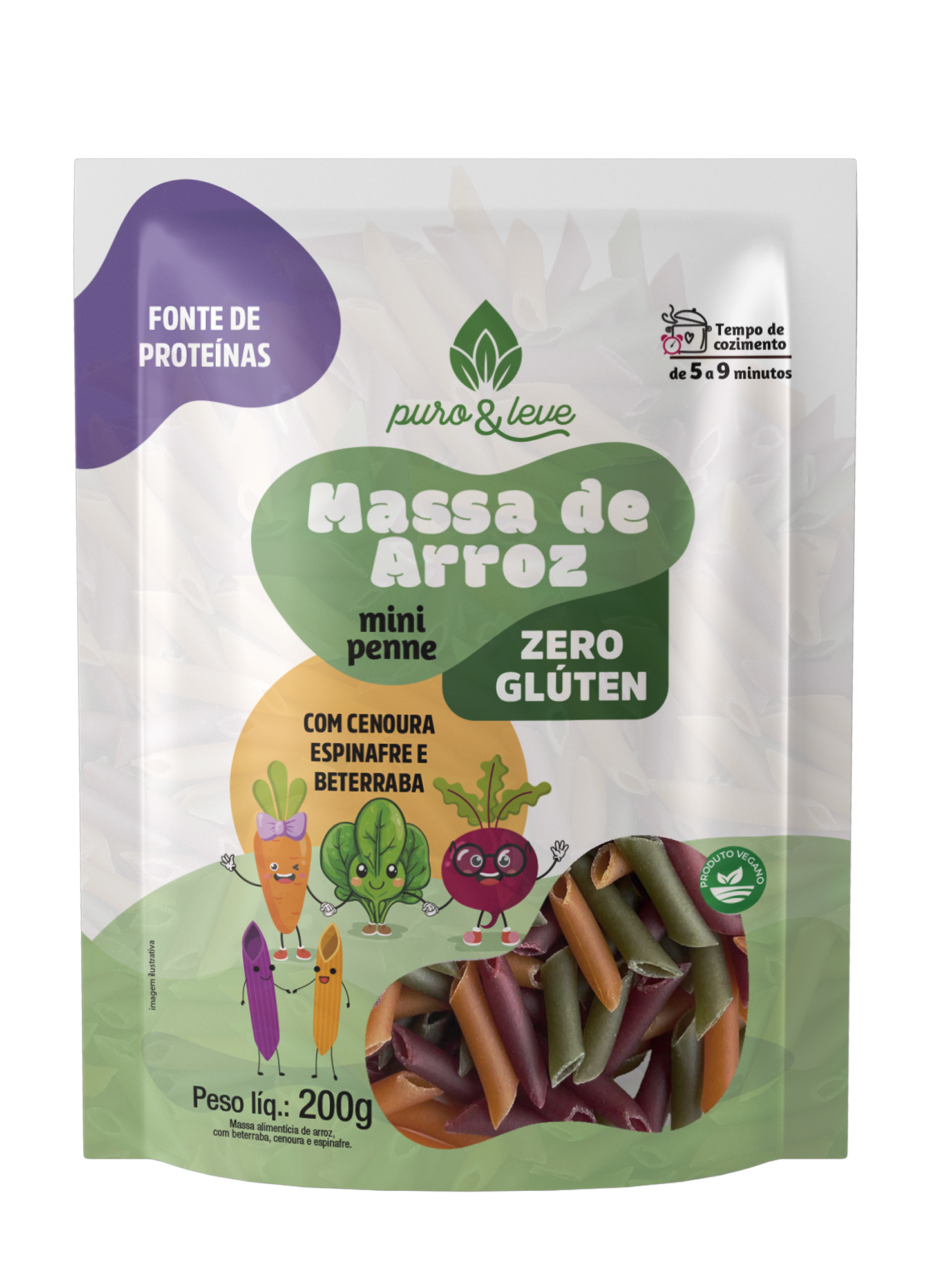 MASSA DE ARROZ 200G – Lista de ingredientes: Farinha de arroz, farelo de arroz, farinha de beterraba, farinha de espinafre, farinha de cenoura,