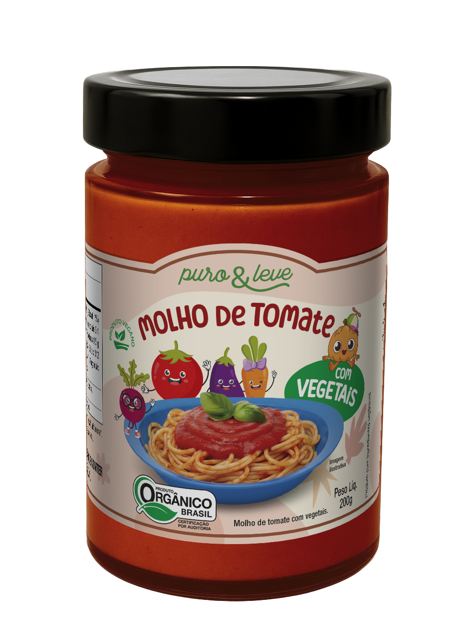 MOLHO DE TOMATE TURBINADO COM VEGETAIS 200g: Lista de ingredientes: Tomate*, cenoura*, berinjela*, beterraba*, abóbora*, sal, polpa de pera, amido de mandioca, cebola, orégano e alho. *Ingredientes orgânicos. NÃO CONTÉM GLÚTEN. ALÉRGICOS: PODE CONTER CASTANHA DE CAJU E DERIVADOS DE SOJA. Validade: 12 meses.