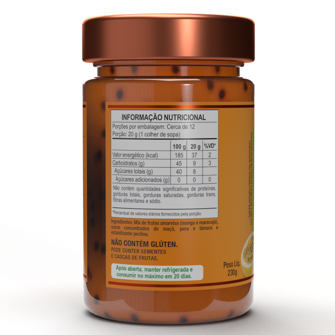 Ingredientes: Mix de frutas amarelas (manga e maracujá), sucos concentrados de maçã, pera e tâmara e estabilizante pectina
